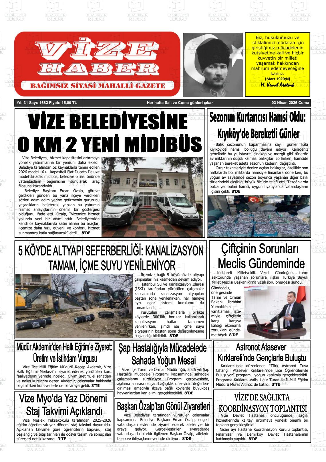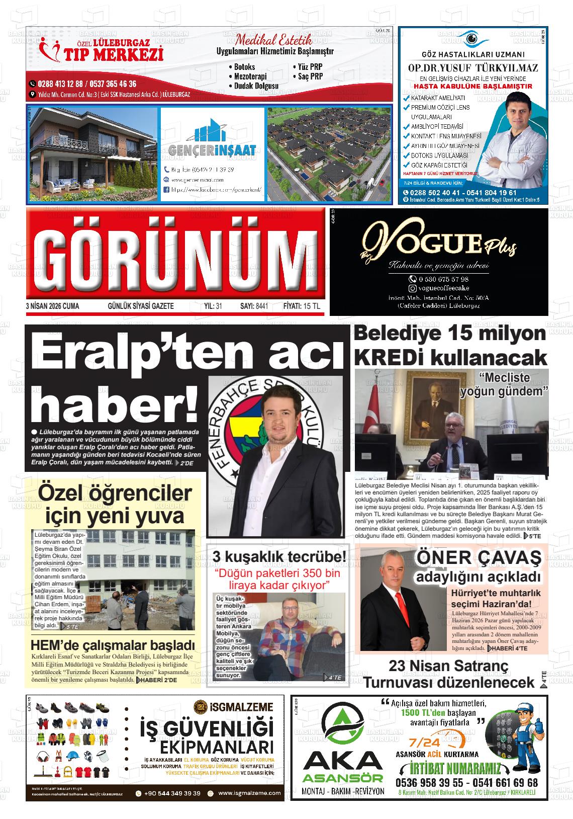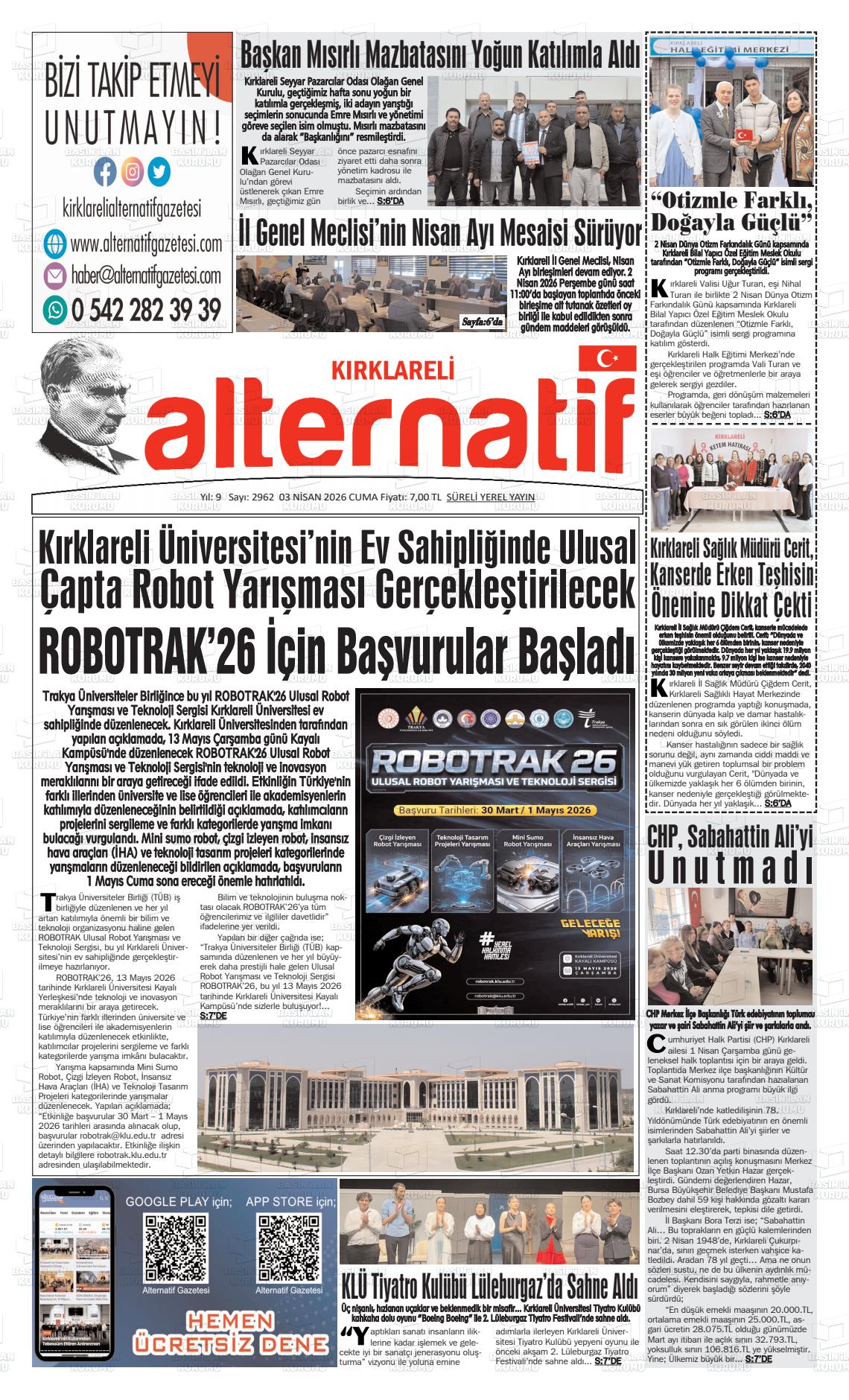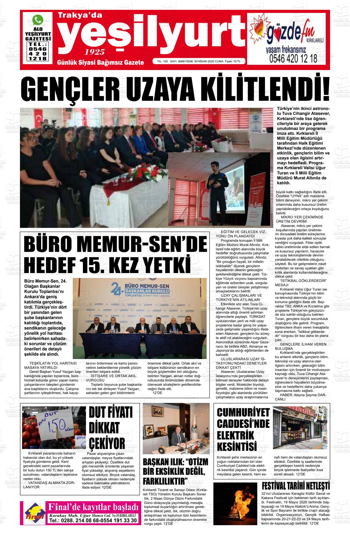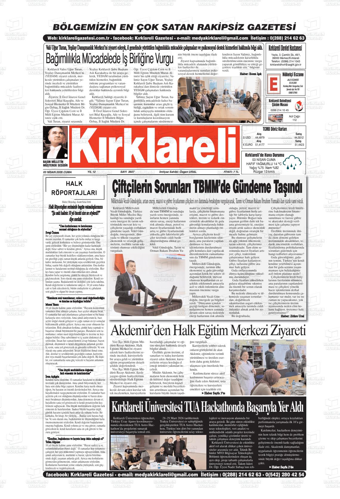 Kırklarelİ Yerel Gazeteleri 03 Nisan 2026, Cuma Günü Manşeti